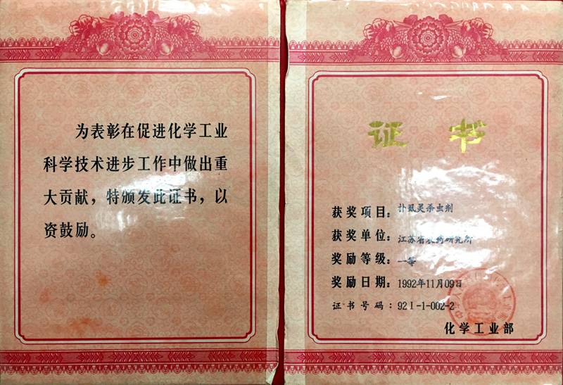 1993.12“撲虱靈殺蟲劑”榮獲“國家科技進步獎”