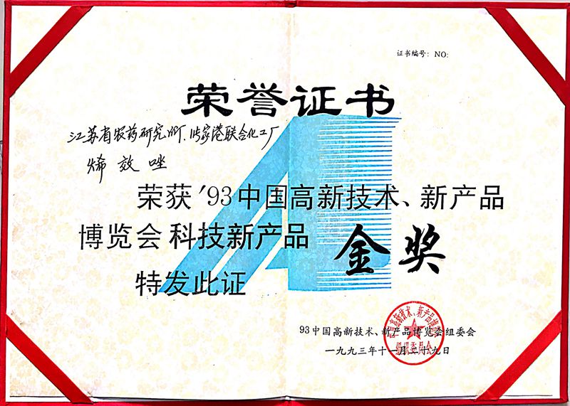1993.“烯效唑”獲得“中國高新技術(shù)博覽會科技新產(chǎn)品”金獎