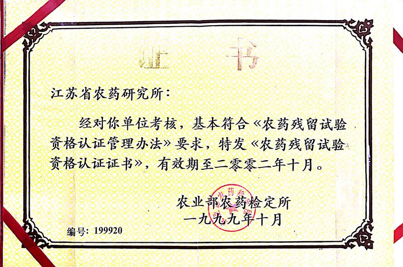 1999.農(nóng)藥鑒定所頒發(fā)《農(nóng)藥殘留試驗資格認證書》