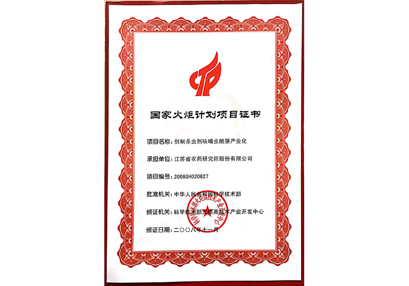 2008“呋喃蟲酰肼產(chǎn)業(yè)化”入選“國家火炬計劃”