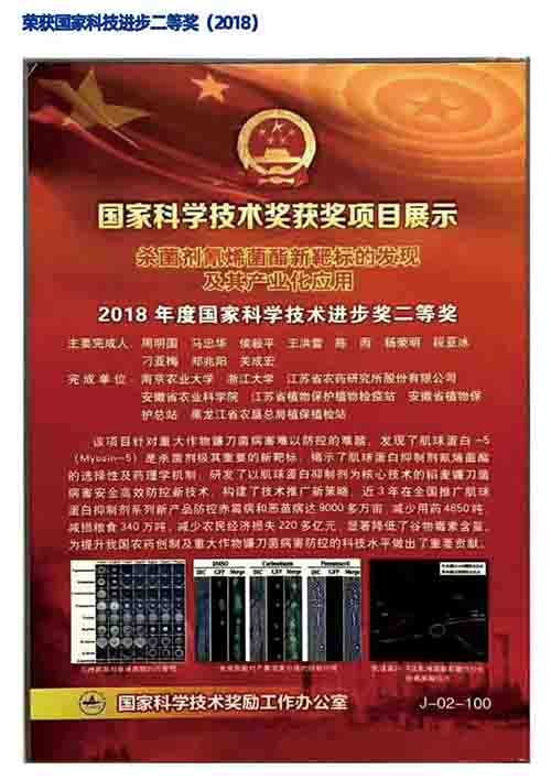中國農業農村部和全國農技推廣中心關于小麥赤霉病防控指導意見藥劑首推氰烯菌酯,氰烯菌酯是目前防治赤霉病藥劑里面降低嘔吐毒素機理最明確的藥劑。氰烯菌酯因其優秀的防病降毒效果,榮獲兩次國家科技進步二等獎,教育部科技進步一等獎,石化系統技術發明二等獎等,獲8項發明專利授權。其中氰烯菌酯復配劑勁興®(480克/升氰烯·戊唑醇懸浮劑)在安徽省六安、懷遠試驗點的降毒效果分別達到了92.2%、96.4%,江蘇儀征植保植檢站數據:使用勁興®比對照毒素降低92.95%,使用勁興®防治的小麥,嘔吐毒素完全達到了糧儲部門收購標準。勁興®也被各省植保系統列為防治小麥赤霉病推薦產品,榮獲植保產品貢獻獎、農民最喜愛的品牌等。