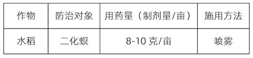 1、防治水稻害蟲。找準用藥時期,建議防治稻飛虱在卵孵化高峰期至低齡若蟲盛發期施藥;防治二化螟、稻縱卷葉螟在卵孵化高峰期至低齡幼蟲盛發期施藥。推薦8-10克/15kg水,注意要均勻噴施。