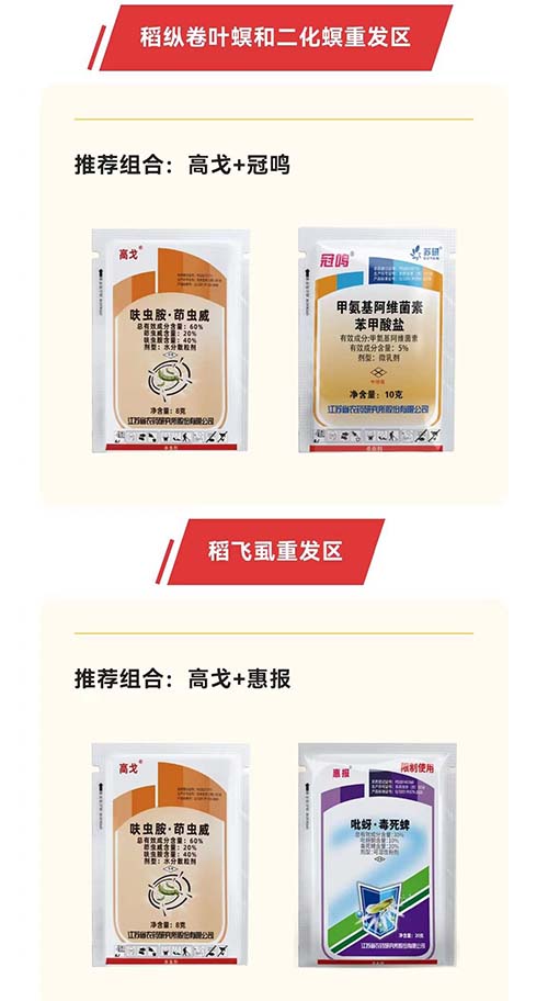 江蘇省農藥研究所股份有限公司新上市產品—高戈®(60%呋蟲胺·茚蟲威水分散粒劑),登記水稻二化螟,同時對水稻稻飛虱和稻縱卷葉螟防效優異。在蟲害發生初期,一次用藥“三蟲”全搞定。